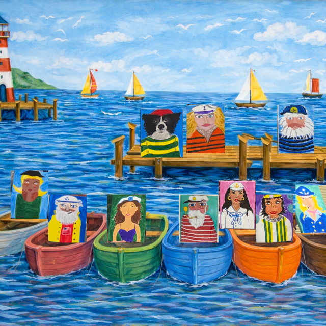 A collaborative art experience that turns individual team portraits into one unified image of how the organization works together. A team-painting experience about who we are, how we show up, and how we belong together. Each person paints a character that becomes part of one shared harbor scene. The final wall assembly is below.