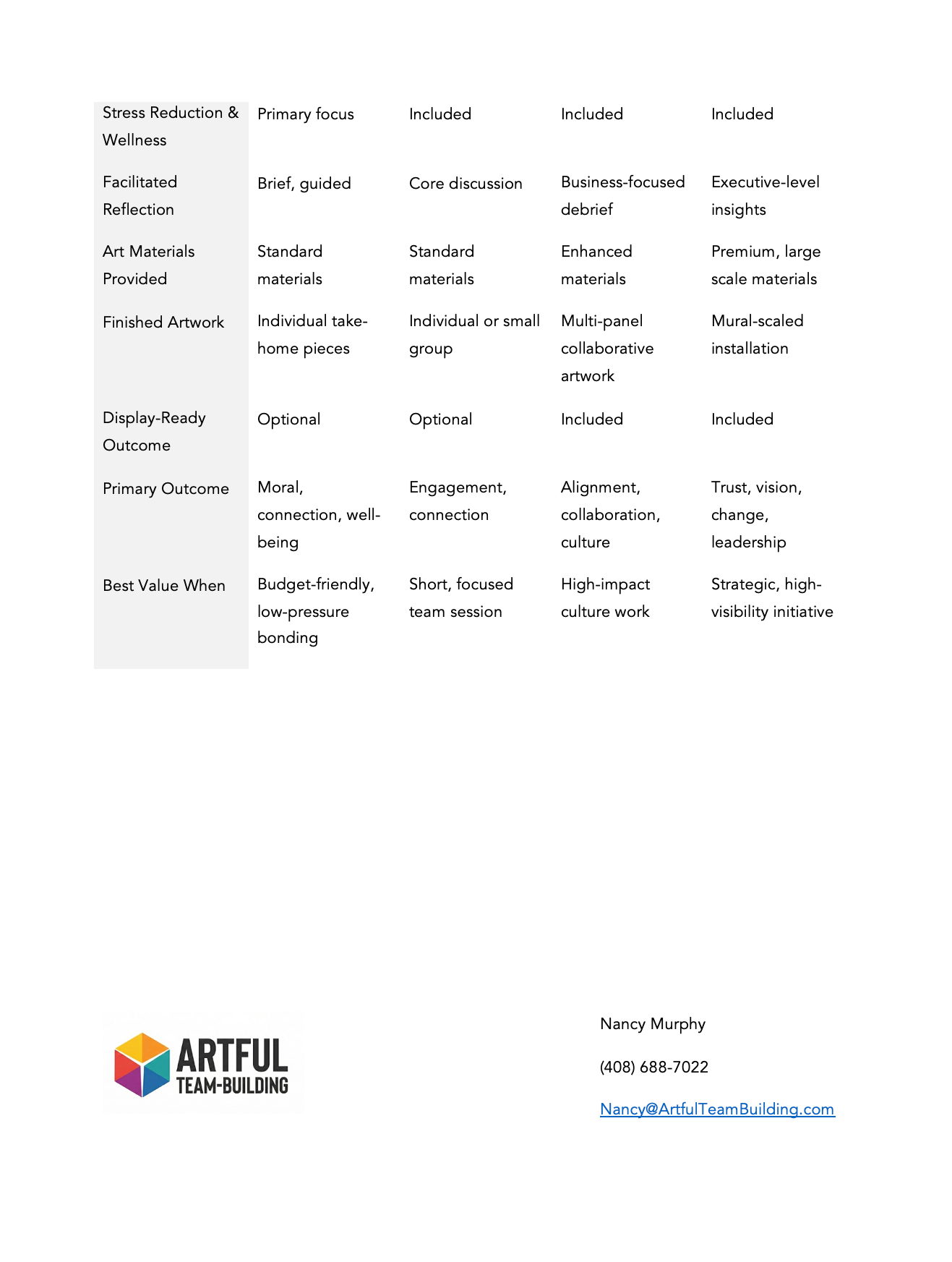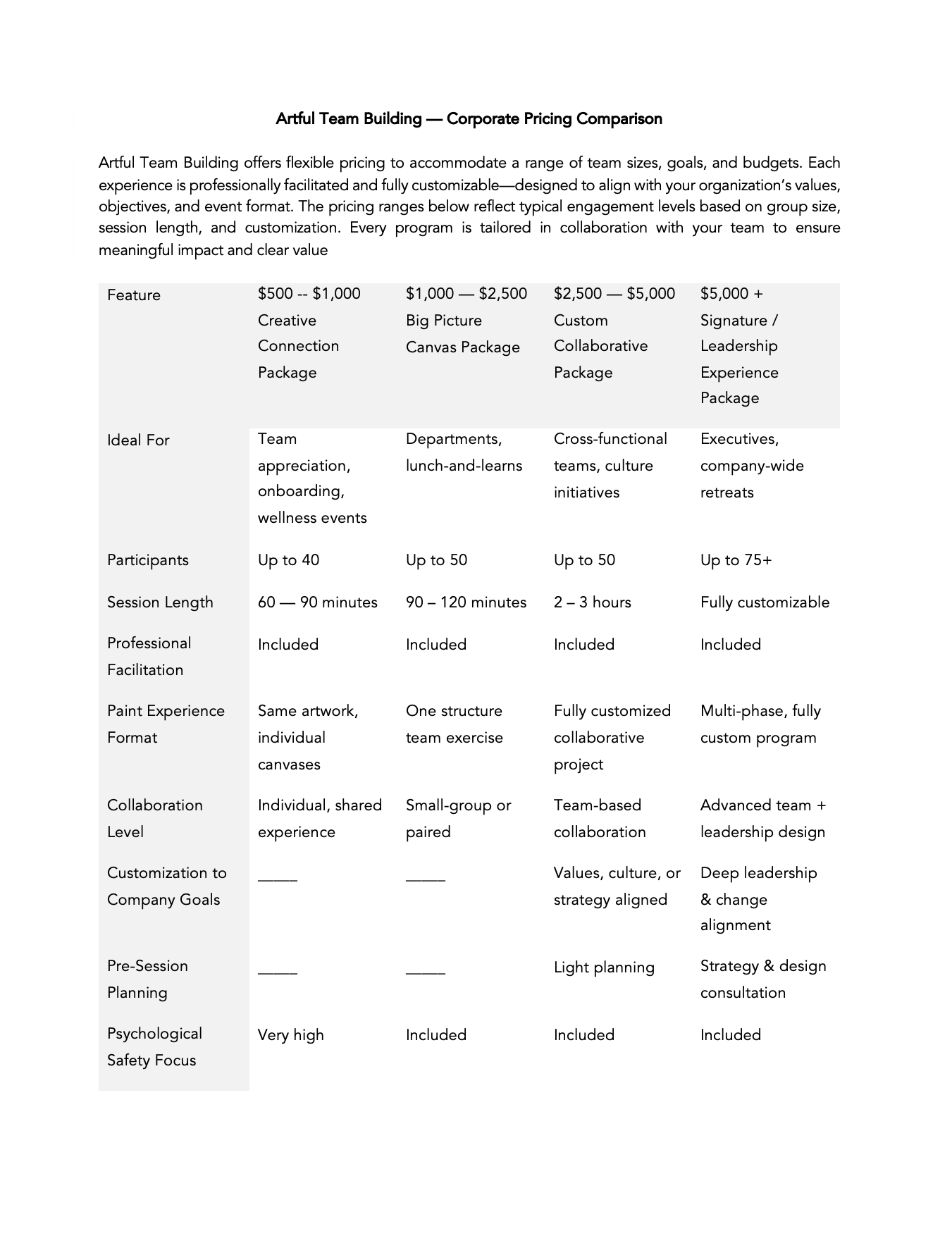 Artful Team Building offers flexible pricing to accommodate a range of team sizes, goals, and budgets. Each experience is professionally facilitated and fully customizable—designed to align with your organization’s values, objectives, and event format. The pricing ranges below reflect typical engagement levels based on group size, session length, and customization. Every program is tailored in collaboration with your team to ensure meaningful impact and clear value. Download pricing comparison.